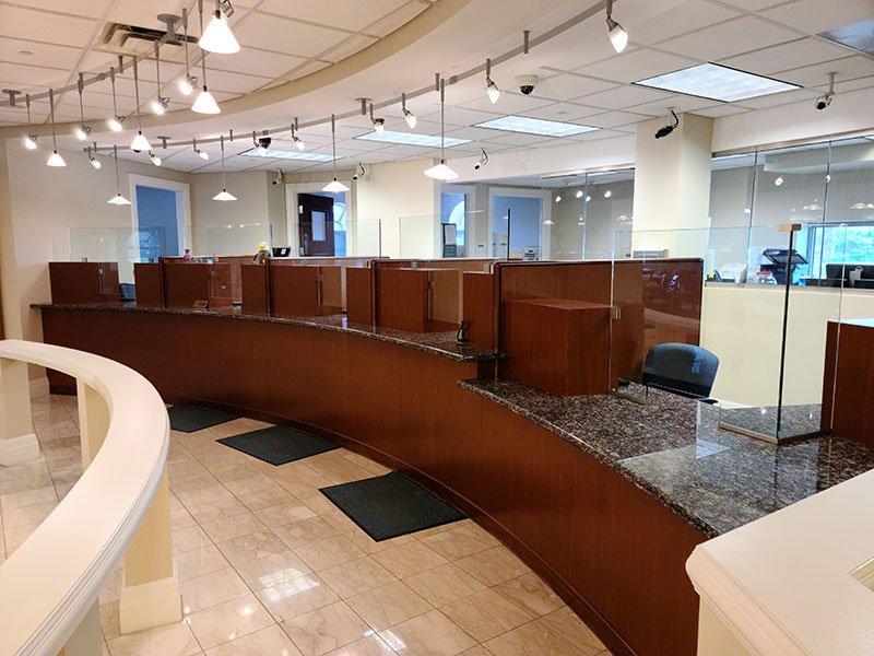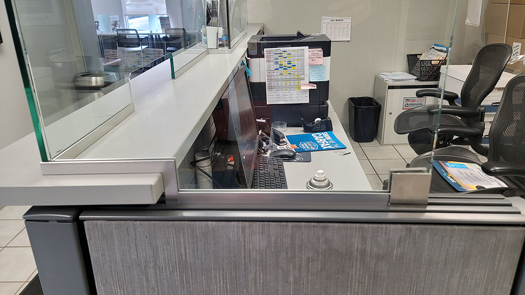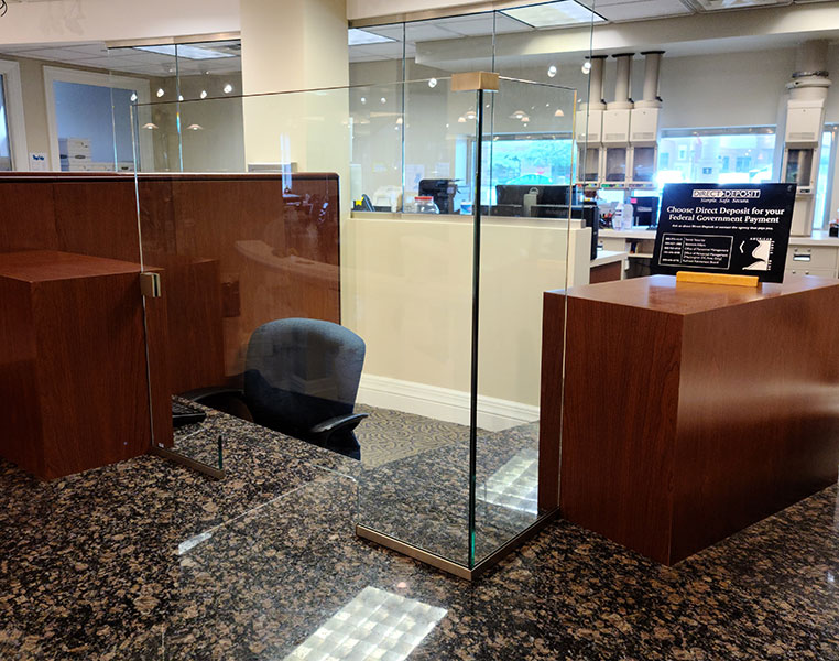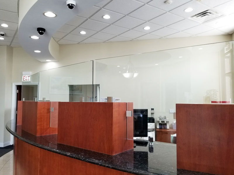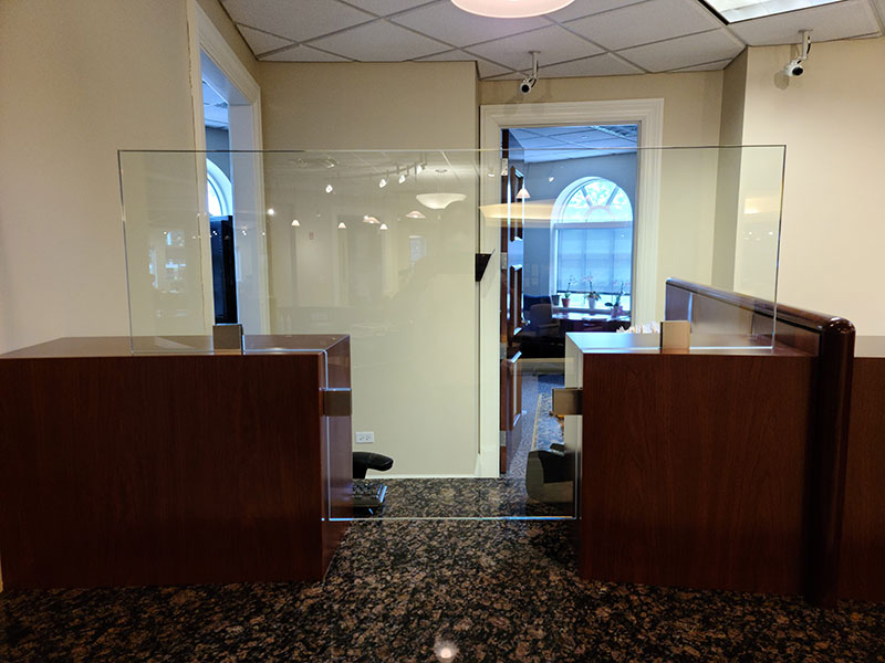 Creative Architectural Glass provides affordable factory direct custom glass solutions that are professionally installed. Our glass dividers and sneeze guards can be designed to your space and needs. Transaction windows and speak thru openings can be conveniently placed into your design. Custom etching and sandblasting is also available, from decorative borders to business logos. There are a number of different hardware options, including chrome, brushed nickel, matte black, oil-rubbed bronze, and more!