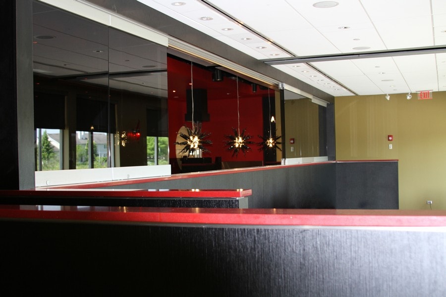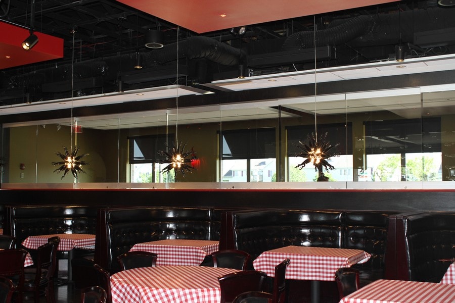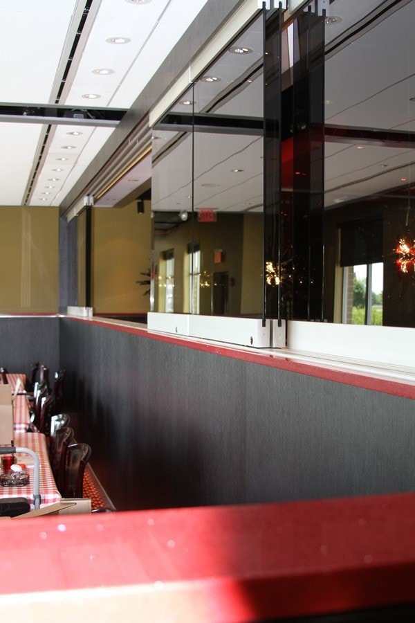 - Sliding glass doors creates a glass divider wall to separate pizza parlor from restaurant seating