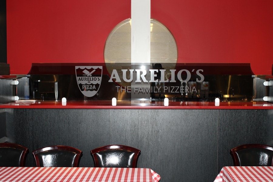 At Creative Architectural Glass, we are happy to take on smaller glass renovation projects that are so vitally important to the success of a small business owner or franchisee. For the Aurelios Pizza glazing project, the look of the entire store was updated with a glass room divider featuring sliding grey glass doors. Because we do sandblasting, etching, and artistic glass work on site in our 20,000 sf facility, it’s no big deal for us to feature a corporate logo on glass. The Aurelios Pizza logo and glass signage shown below is on grey tempered glass, installed with sleek architectural metal standoffs. It provides a great first impression for customers, reinforcing the client’s branding message with an upscale, modern classy look.